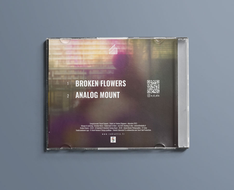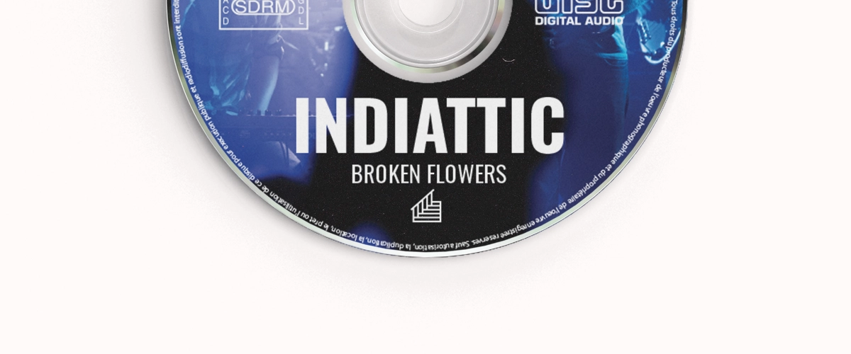 Dans le cadre de la sortie de leur album Broken Flowers, un CD deux titres, le groupe Indiattic m’a confié la réalisation du visuel de la pochette et du CD. L’objectif était de créer un design qui reflète l’univers musical du groupe tout en respectant les contraintes techniques liées à la production physique du CD