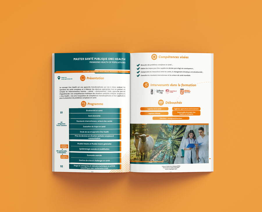 Identité Visuelle Unifiée : Le design final a permis de standardiser la présentation des fiches de parcours (Options et Masters), créant une continuité visuelle entre le livret, les Roll-ups et l’image globale de VetAgro Sup.